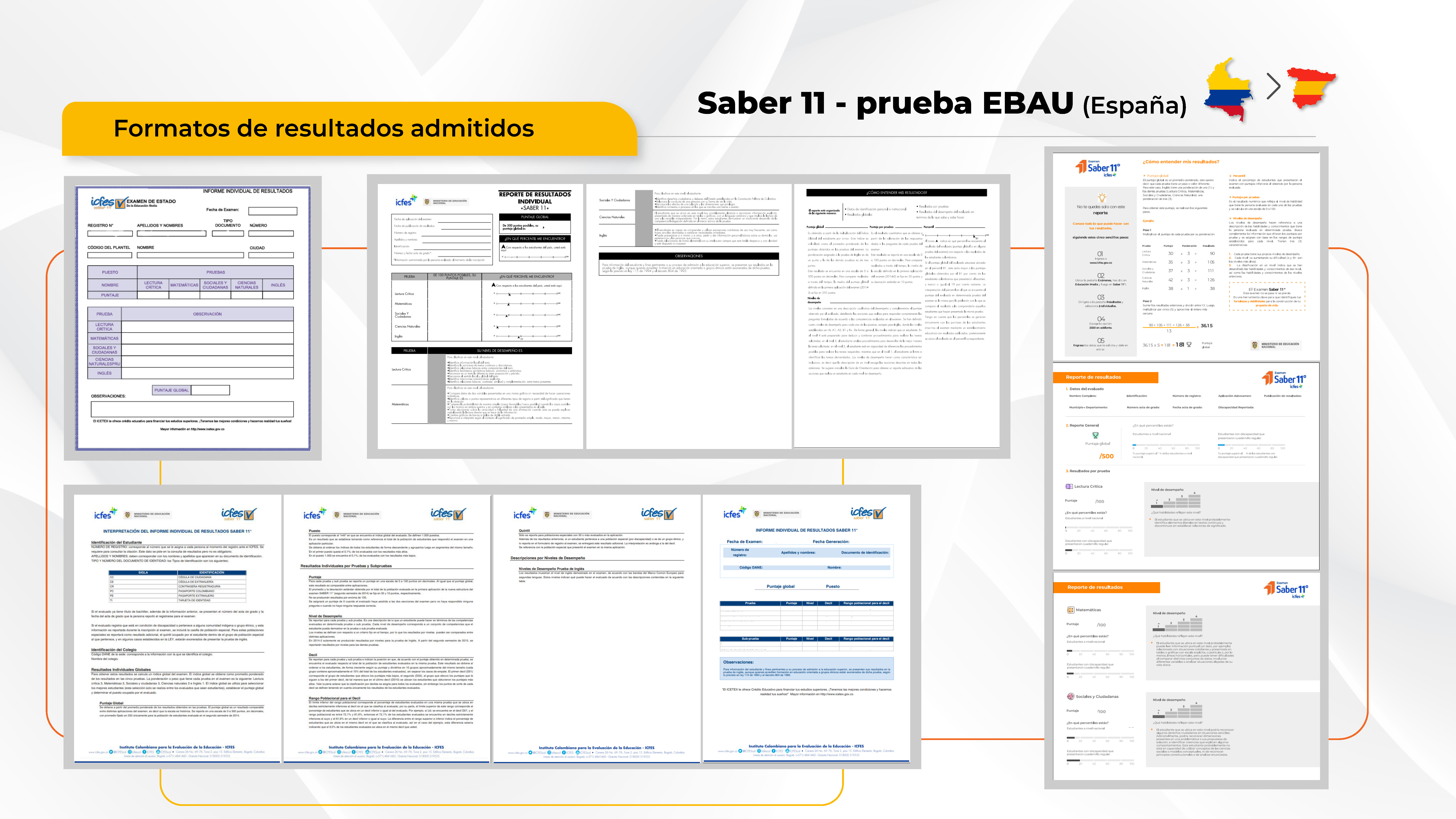 En Colombia, las personas mayores de 18 años de edad y que hayan obtenido un puntaje igual o superior a 30 puntos en el Examen de Validación del Bachillerato Académico del Instituto Colombiano para la Evaluación de la Educación (Icfes) pueden certificar su título de bachillerato académico en un solo examen* y no deben presentar los certificados de los grados 10 y 11 junto con los resultados de prueba del saber 11. Al haber aprobado el Examen de Validación, estas personas obtendrán un reporte de resultados individuales de Saber 11 y podrán utilizar este reporte de resultados para la correspondencia con la tabla de equivalencias entre Saber 11 (Colombia) y EBADU (España) definida en el convenio entre los dos países.