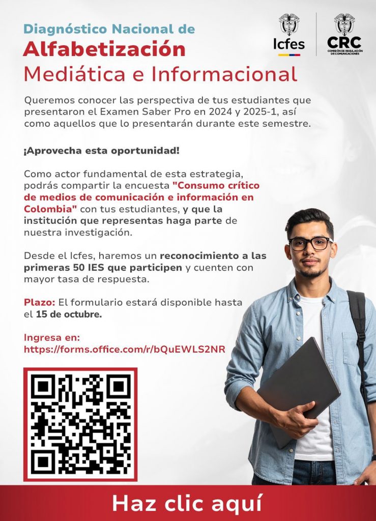 Bogotá, 7 de octubre  de 2025 – (Con información de la CRC) La Comisión de Regulación de Comunicaciones (CRC) y el Instituto Colombiano para la Evaluación de la Educación (Icfes) lanzan la encuesta base para el primer diagnóstico nacional de las competencias de Alfabetización Mediática e Informacional (AMI) de los estudiantes de educación superior en Colombia. Se trata de un ejercicio sin precedentes que permitirá conocer cómo los jóvenes colombianos consumen, interpretan y usan la información en medios tradicionales y digitales, así como en plataformas en línea.